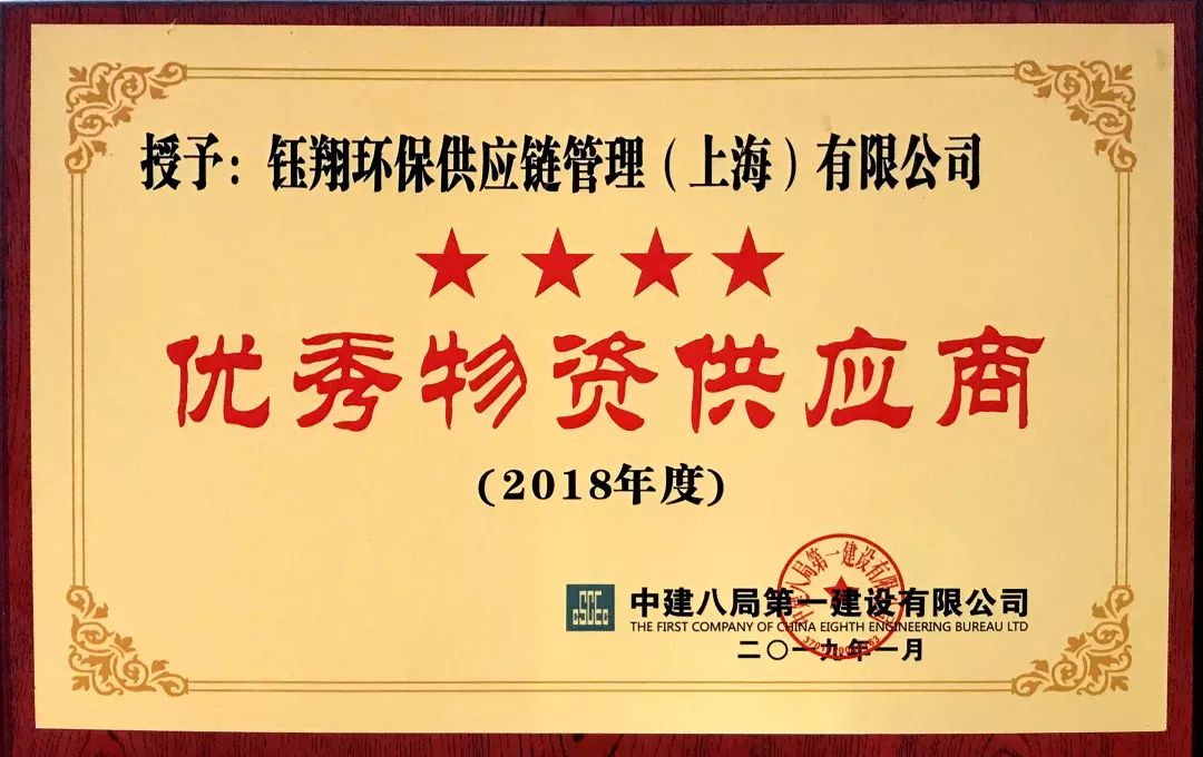 近日,鈺翔環保供應鏈管理(上海)有限公司被中建八局第一建設有限公司評為優秀物資供應商。