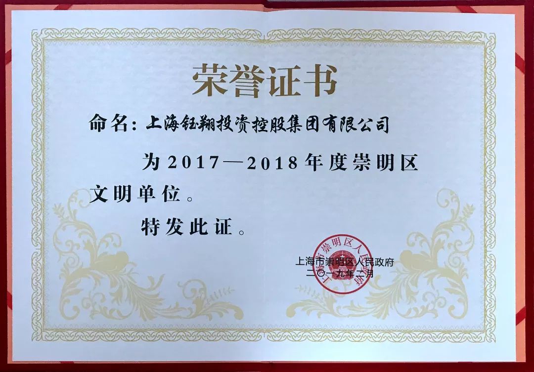 近日,鈺翔控股集團再次被評為上海市崇明區(qū)文明單位,截至目前,鈺翔控股集團已經連續(xù)榮獲第十七屆(2013—2014年度)、第十八屆(2015—2016年度)上海市文明單位榮譽稱號,目前正在積極參評第十九屆(2017—2018年度)上海市文明單位。